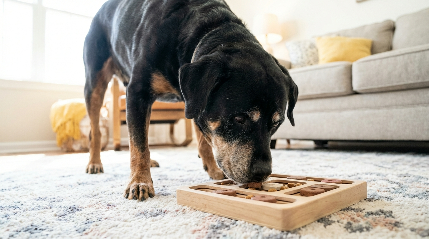 Puzzle toys offer excellent senior rottweiler enrichment. Choose slow feeders or treat-dispensing toys that require problem-solving. Keep difficulty moderate. The goal is engagement, not frustration.